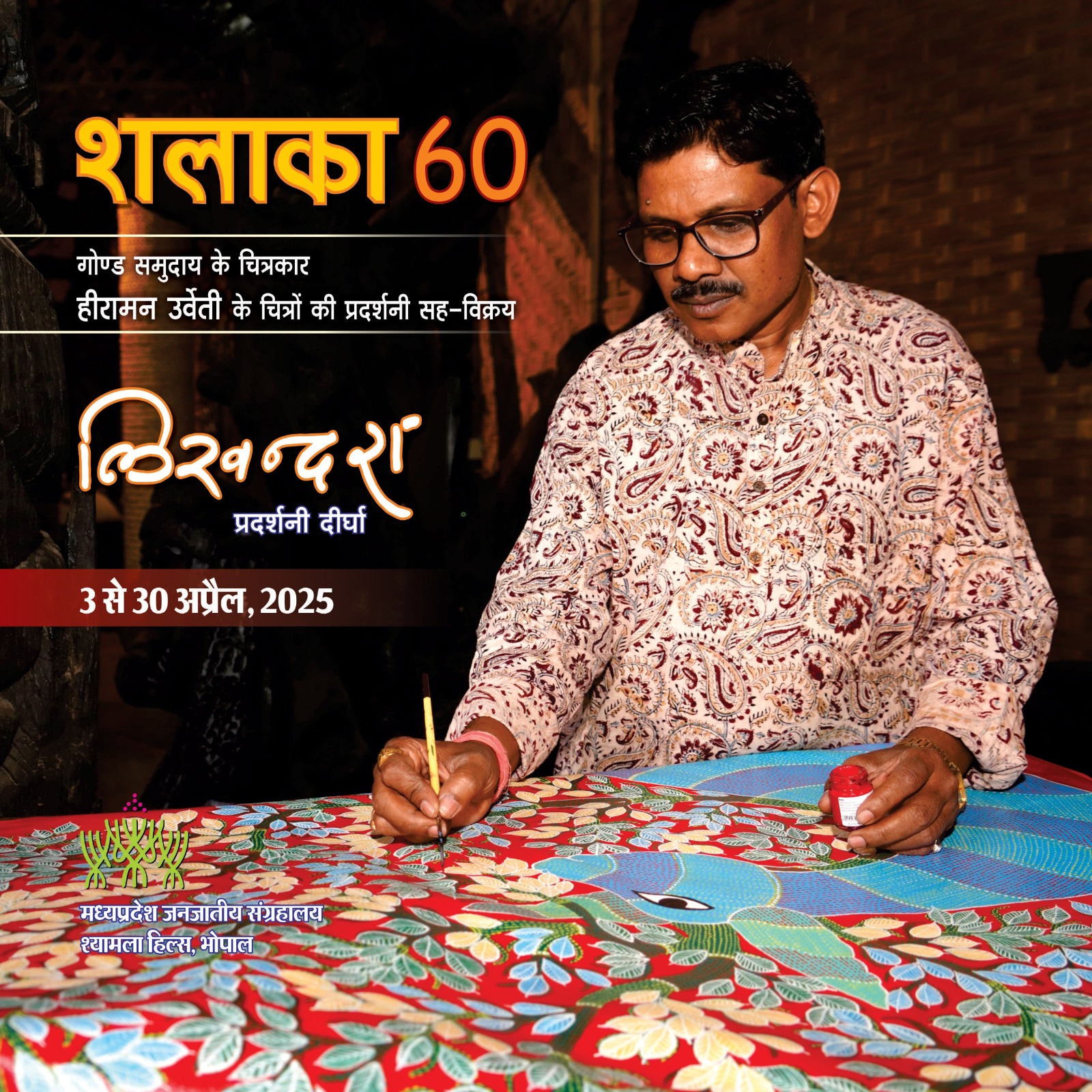 शलाका 71 गोण्ड समुदाय के चित्रकार श्री हीरामन उर्वेती के चित्रों की प्रदर्शनी सह-विक्रय का संयोजन प्रदर्शनी दीर्घा 3 से 30 , 2025 मध्यप्रदेश जनजातीय संग्रहालय श्यामला हिल्स, भोपाल