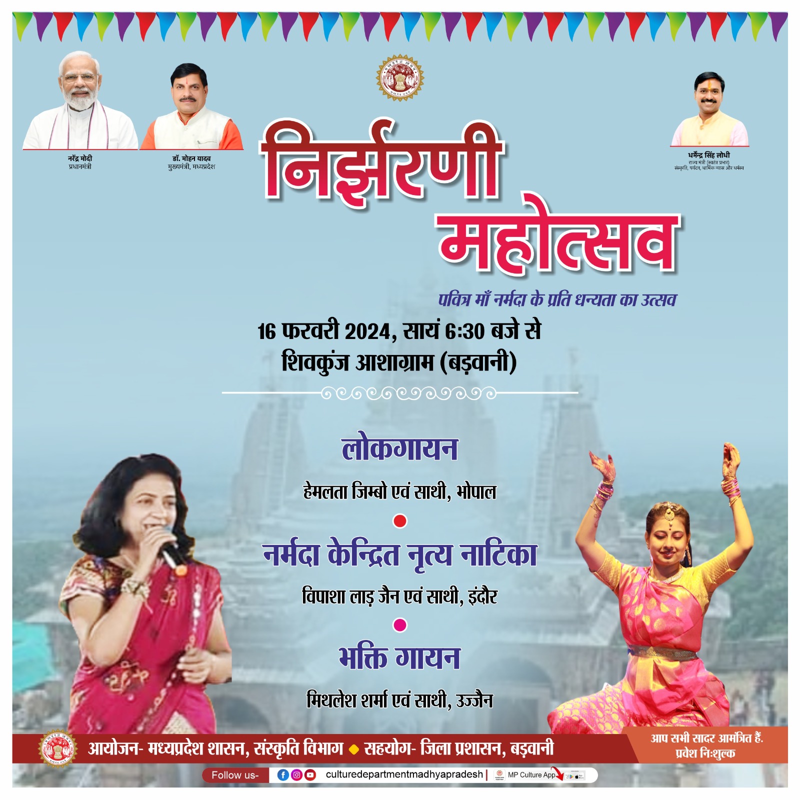 मध्यप्रदेश शासन, संस्कृति विभाग का प्रतिष्ठा आयोजन “निर्झरणी महोत्सव” 15-16 फरवरी, 2024 को होगा। पवित्र मां नर्मदा के प्रति धन्यता का उत्सव नर्मदापुरम, जबलपुर, नरसिंहपुर, देवास, ओंकारेश्वर, मंडलेश्वर, धार एवं बड़वानी में आयोजित होगा। इस दौरान विभिन्न कलाकार लोक गायन, नृत्य-नाटिका, भक्ति गायन के कार्यक्रम प्रस्तुत करेंगे। इन कार्यक्रमों में प्रवेश निःशुल्क है। आप सभी सादर आमंत्रित हैं।