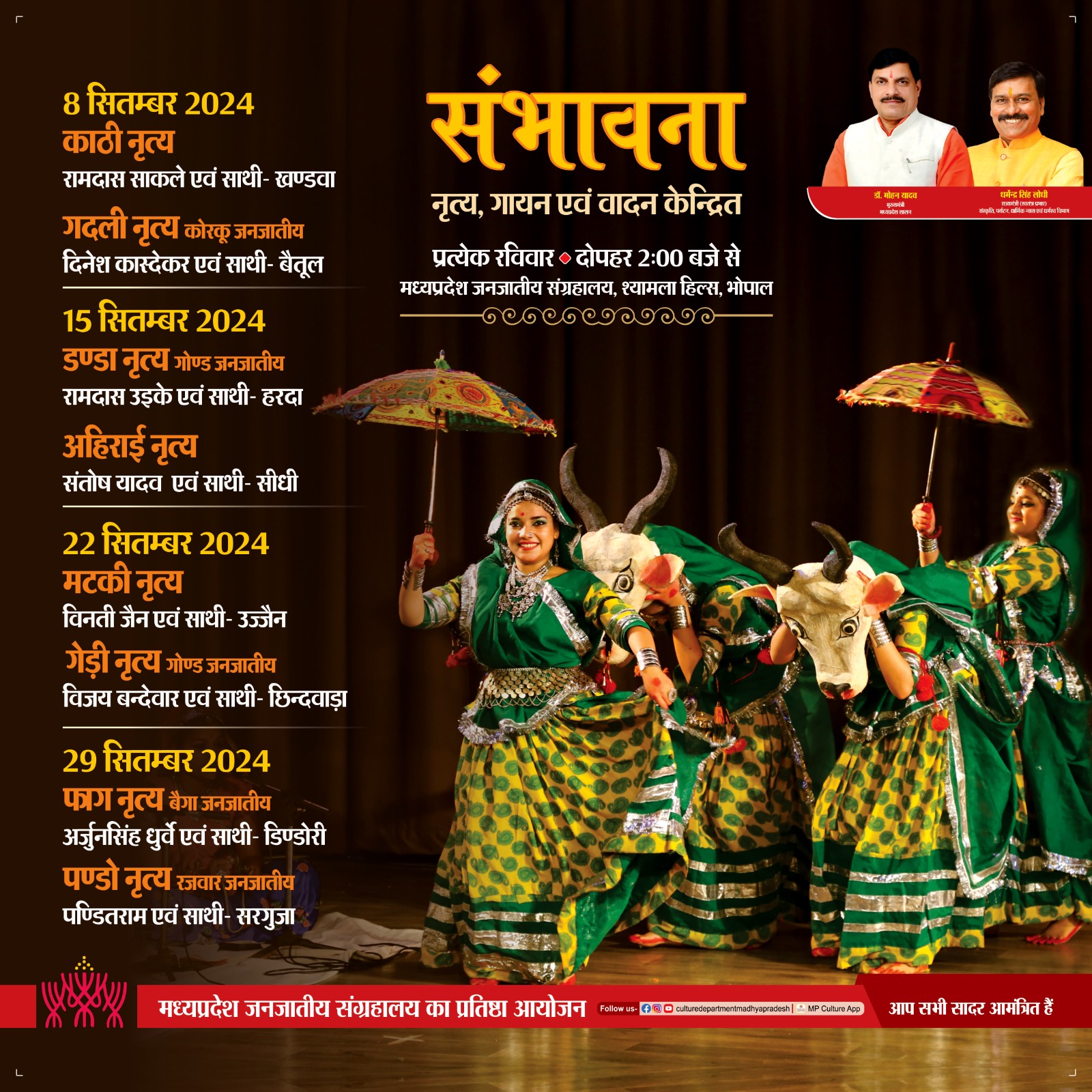 संभावना नृत्य, गायन एवं वादन केन्द्रित दोपहर 2:00 बजे से प्रत्येक रविवार मध्यप्रदेश जनजातीय संग्रहालय, श्यामला हिल्स, भोपाल मध्यप्रदेश जनजातीय संग्रहालय का प्रतिष्ठा आयोजन