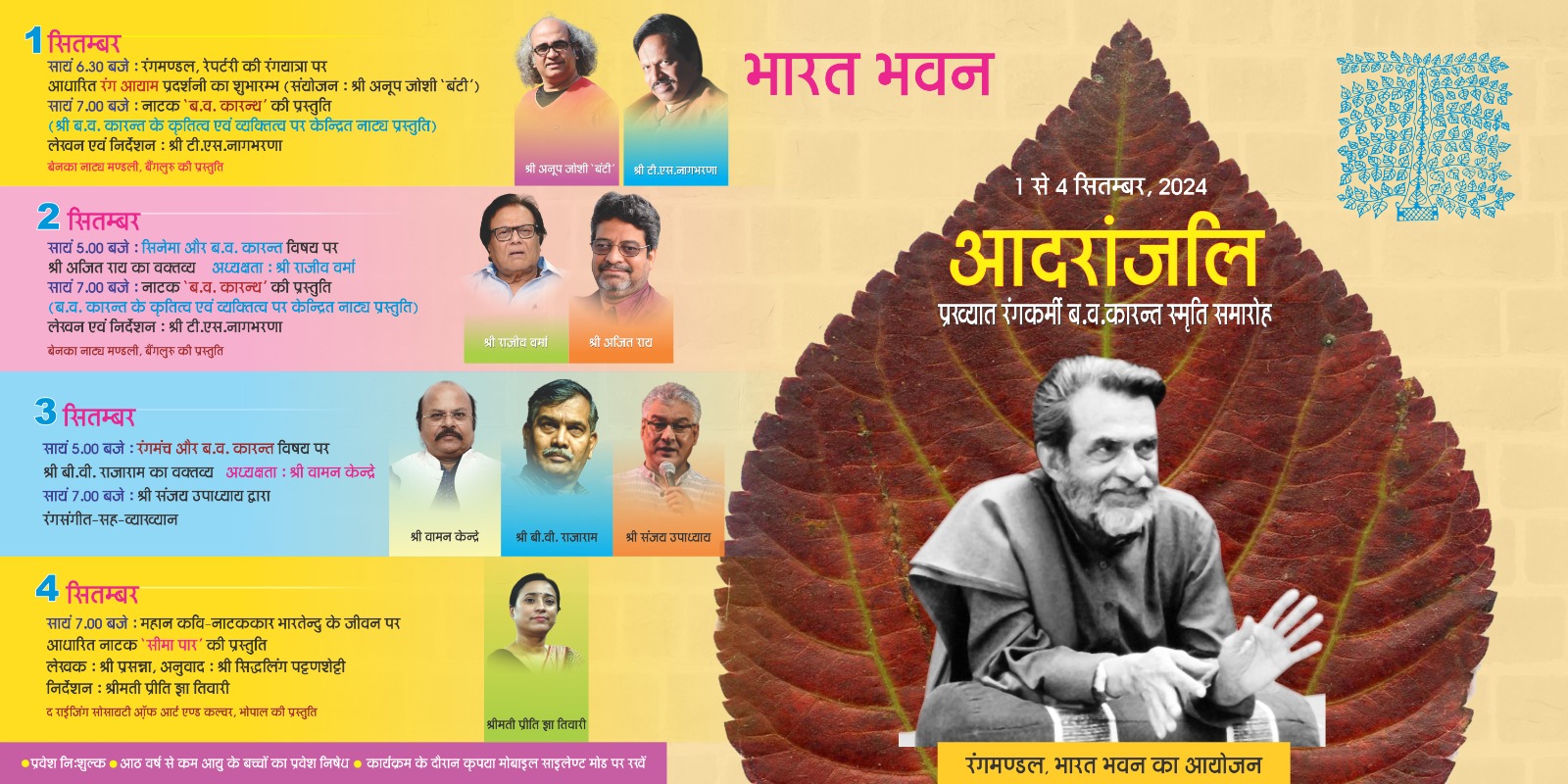 1 सितम्बर सायं 6.30 बजे : रंगमण्डल, रेपर्टरी की रंगयात्रा पर आधारित रंग आयाम प्रदर्शनी का शुभारम्भ (संयोजन : श्री अनूप जोशी 'बंटी') सायं 7.00 बजे : नाटक 'ब.व. कारन्थ' की प्रस्तुति (श्री ब.व. कारन्त के कृतित्व एवं व्यक्तित्व पर केन्द्रित नाट्य प्रस्तुति) लेखन एवं निर्देशन : श्री टी. एस. नागभरणा